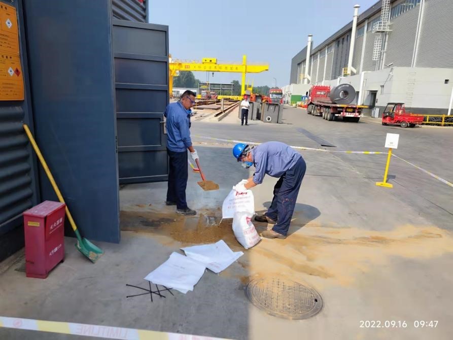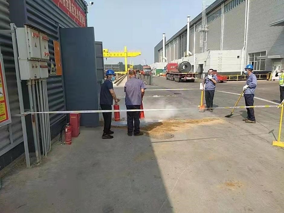 火情解除后,负责处置危废泄漏的队员用编织袋将污染的沙土装袋,并用扎带捆牢放至危废间,清理好现场后,处置队员向应急指挥部汇报本次演练结束。