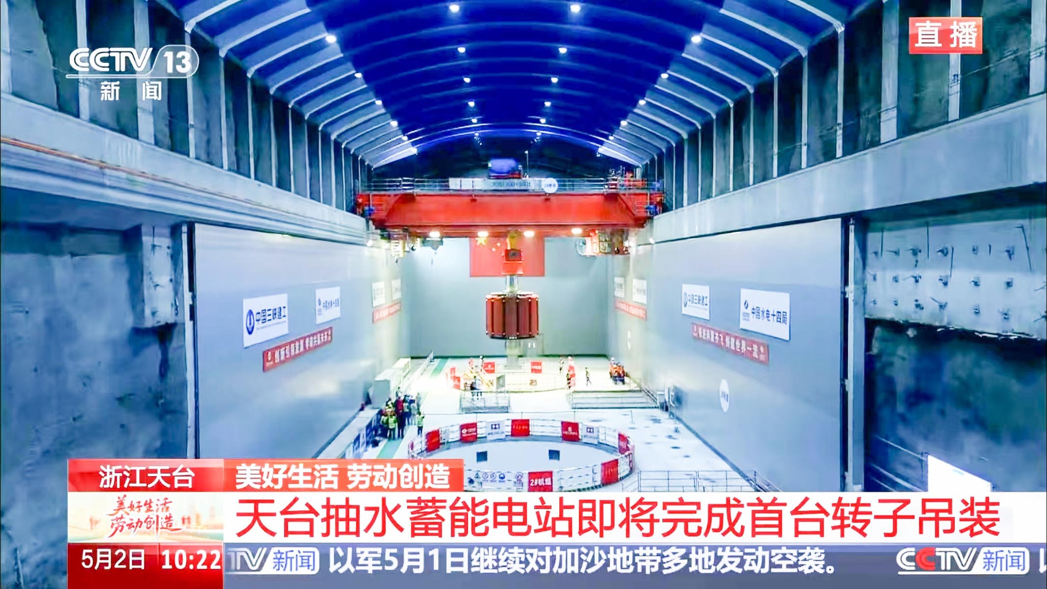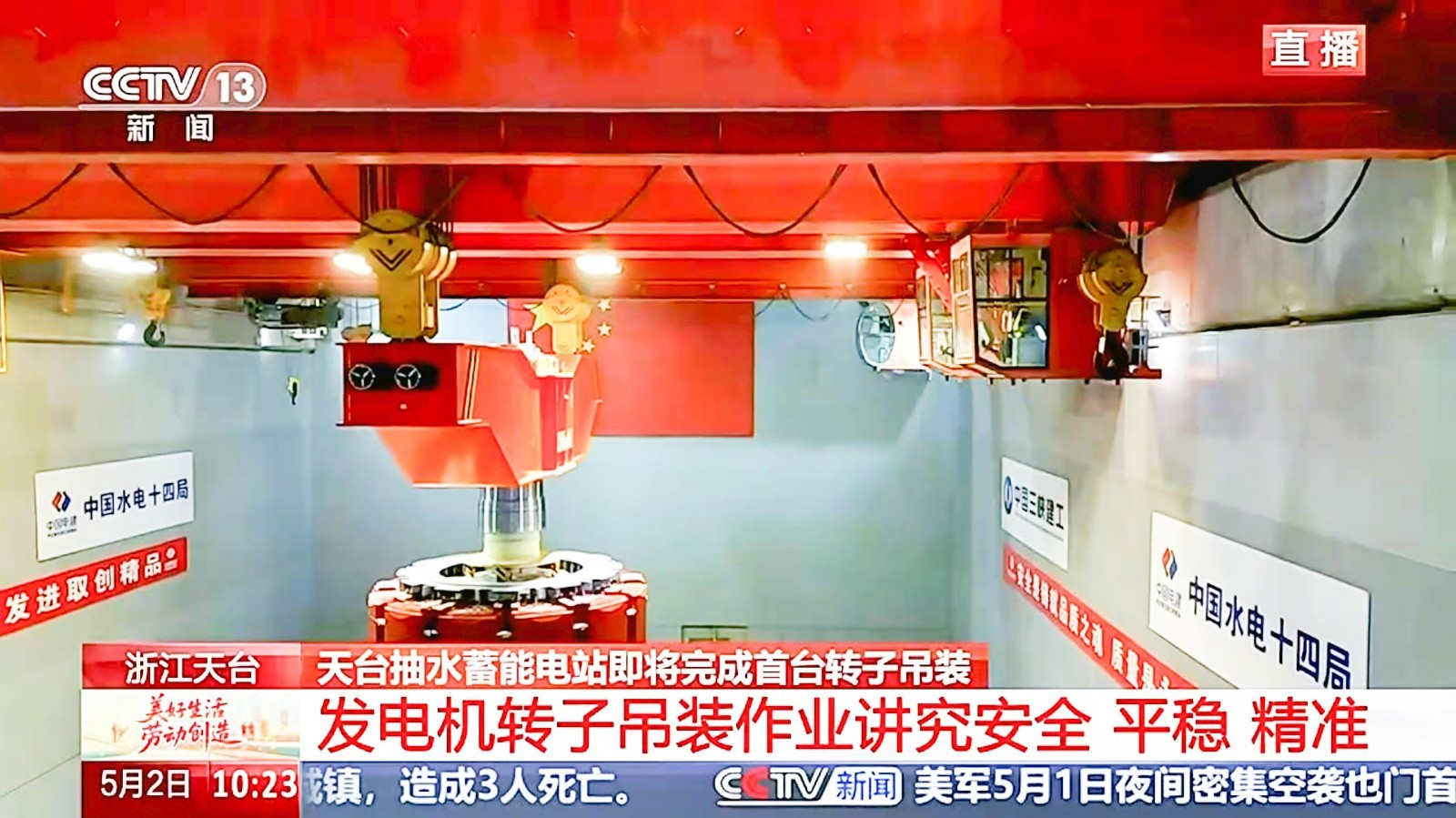 5月2日上午,在中央电视台新闻直播现场,河南OD体育两台300吨新中式桥式起重机将浙江天台抽水蓄能电站1号机组的转子沿着预定的吊装路线平稳、精准地吊入1号机坑,标志着我国首台单机容量425兆瓦抽水蓄能机组安装工程取得里程碑式进展。